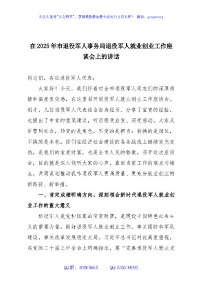 / 在2025年市退役军人事务局退役军人就业创业工作座谈会上的讲话