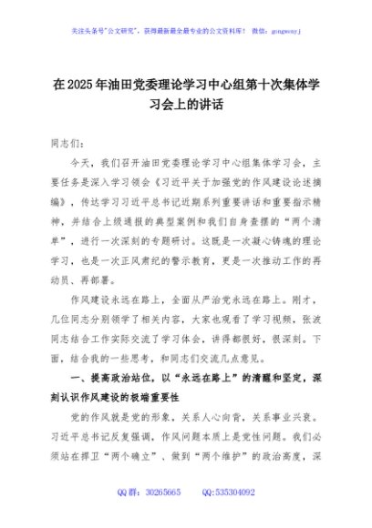 / 在2025年油田党委理论学习中心组第十次集体学习会上的讲话