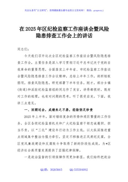/ 在2025年区纪检监察工作座谈会暨风险隐患排查工作会上的讲话