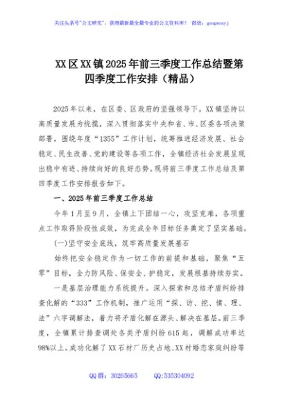 XX区XX镇2025年前三季度工作总结暨第四季度工作安排(精品)