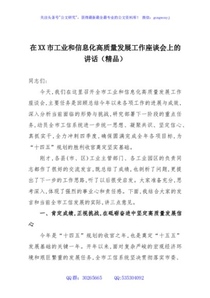 / 在XX市工业和信息化高质量发展工作座谈会上的讲话(精品)