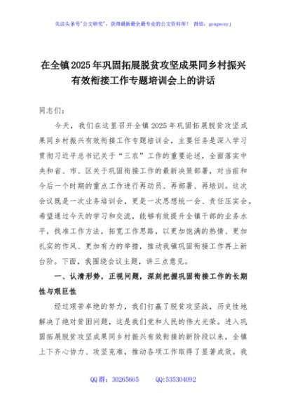 / 在全镇2025年巩固拓展脱贫攻坚成果同乡村振兴有效衔接工作专题培训会上的讲话