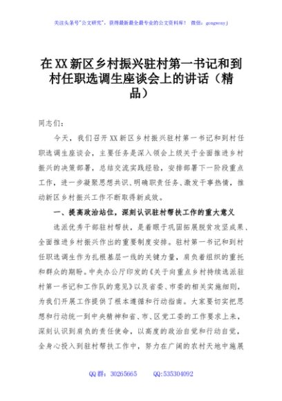 在XX新区乡村振兴驻村第一书记和到村任职选调生座谈会上的讲话(精品)