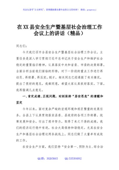 / 在XX县安全生产暨基层社会治理工作会议上的讲话(精品)