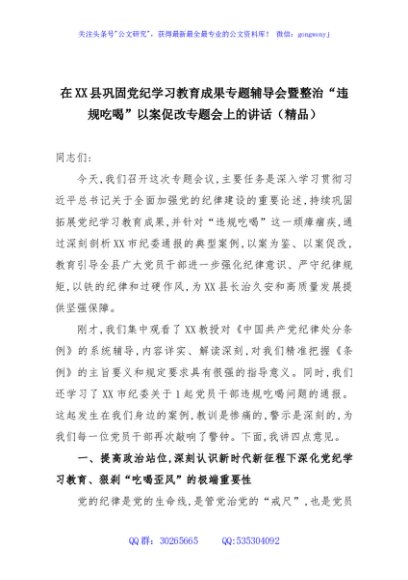 / 在XX县巩固党纪学习教育成果专题辅导会暨整治“违规吃喝”以案促改专题会上的讲话(精品)