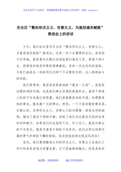 / 在全区“整治形式主义、官僚主义,为基层减负赋能”推进会上的讲话