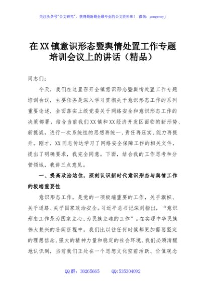 / 在XX镇意识形态暨舆情处置工作专题培训会议上的讲话(精品)