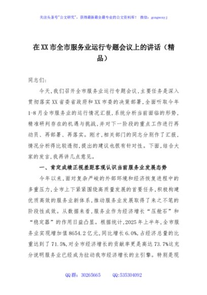 / 在XX市全市服务业运行专题会议上的讲话(精品)