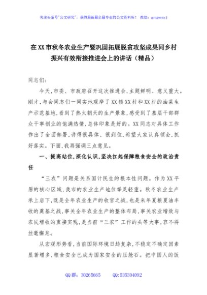 / 在XX市秋冬农业生产暨巩固拓展脱贫攻坚成果同乡村振兴有效衔接推进会上的讲话(精品)