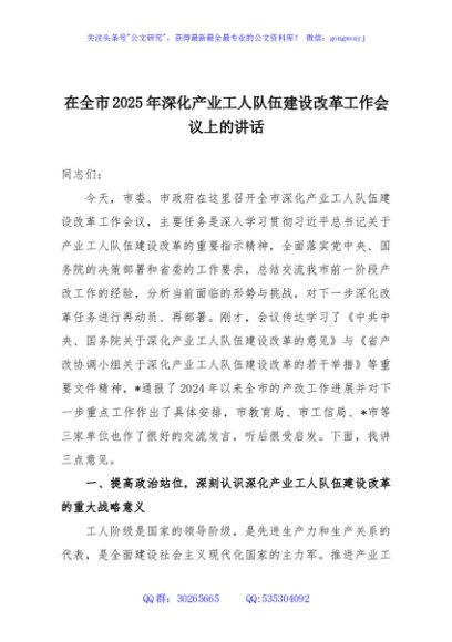 / 在全市2025年深化产业工人队伍建设改革工作会议上的讲话