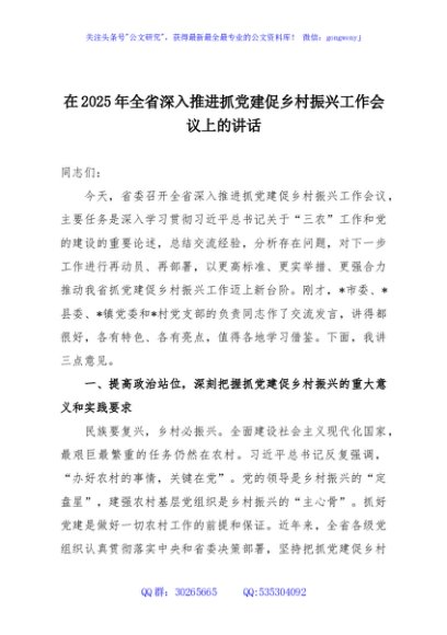 / 在2025年全省深入推进抓党建促乡村振兴工作会议上的讲话