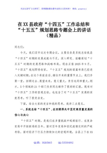 / 在XX县政府“十四五”工作总结和“十五五”规划思路专题会上的讲话(精品)