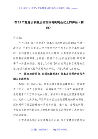 / 在XX市党建引领基层治理协调机制会议上的讲话(精品)