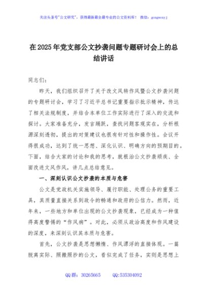 / 在2025年党支部公文抄袭问题专题研讨会上的总结讲话