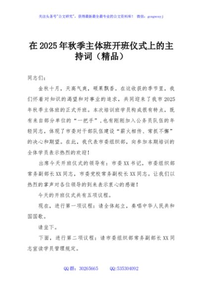 / 在2025年秋季主体班开班仪式上的主持词(精品)