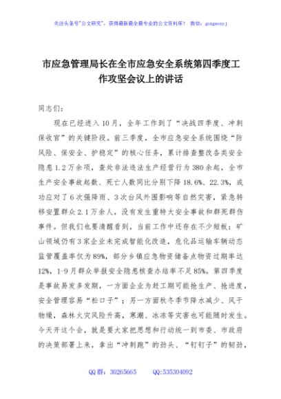 / 市应急管理局长在全市应急安全系统第四季度工作攻坚会议上的讲话
