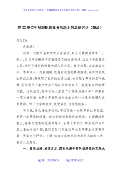 / 在XX单位中层副职讲业务活动上的总结讲话(精品)
