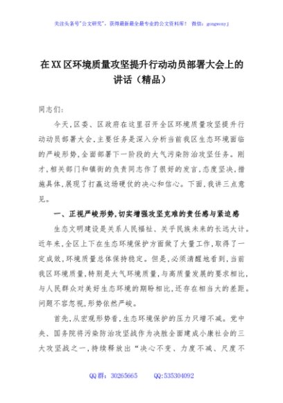 / 在XX区环境质量攻坚提升行动动员部署大会上的讲话(精品)