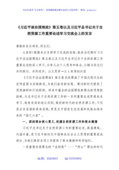 / 《习近平谈治国理政》第五卷以及习近平总书记关于自然资源工作重要论述学习交流会上的发言