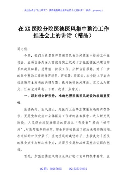 / 在XX医院分院医德医风集中整治工作推进会上的讲话(精品)