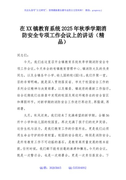 / 在XX镇教育系统2025年秋季学期消防安全专项工作会议上的讲话(精品)