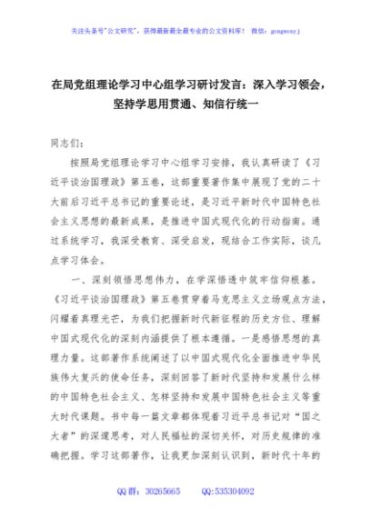 / 在局党组理论学习中心组学习研讨发言:深入学习领会,坚持学思用贯通、知信行统一