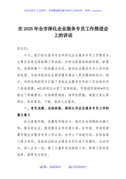 / 在2025年全市深化企业服务专员工作推进会上的讲话