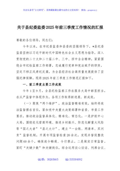 / 关于县纪委监委2025年前三季度工作情况的汇报