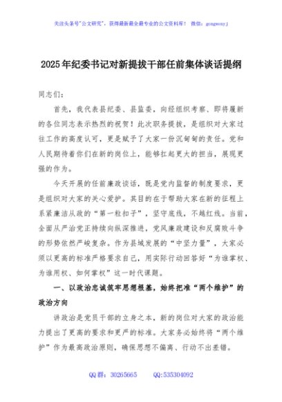 / 2025年纪委书记对新提拔干部任前集体谈话提纲
