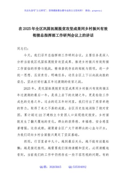 / 在2025年全区巩固拓展脱贫攻坚成果同乡村振兴有效衔接总指挥部工作研判会议上的讲话