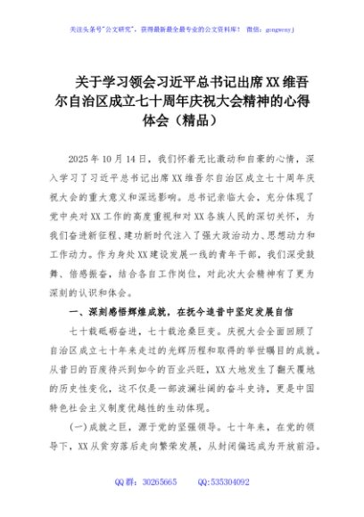 / 关于学习领会习近平总书记出席XX维吾尔自治区成立七十周年庆祝大会精神的心得体会(精品)