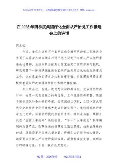 / 在2025年四季度集团深化全面从严治党工作推进会上的讲话