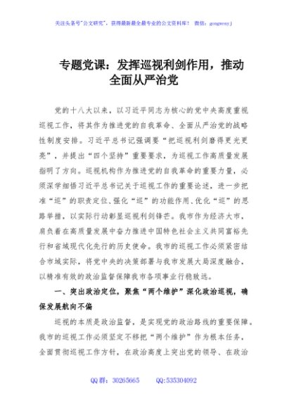 / 专题党课:发挥巡视利剑作用,推动全面从严治党