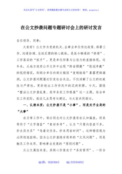 / 在公文抄袭问题专题研讨会上的研讨发言