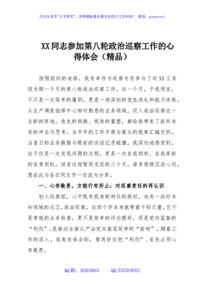 / XX同志参加第八轮政治巡察工作的心得体会(精品)