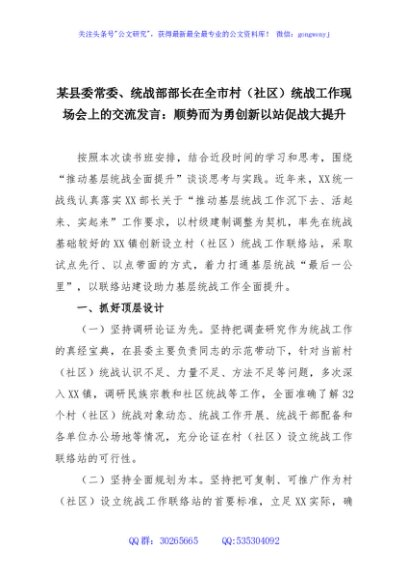 / 某县委常委、统战部部长在全市村(社区)统战工作现场会上的交流发言:顺势而为勇创新以站促战大提升