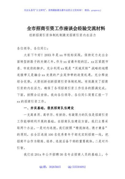 / 全市招商引资工作座谈会经验交流材料