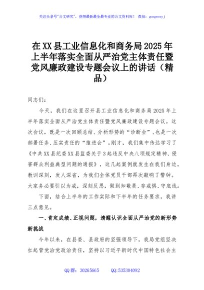 / 在XX县工业信息化和商务局2025年上半年落实全面从严治党主体责任暨党风廉政建设专题会议上的讲话(精品)