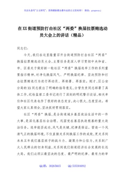 / 在XX街道预防打击社区“两委”换届拉票贿选动员大会上的讲话(精品)