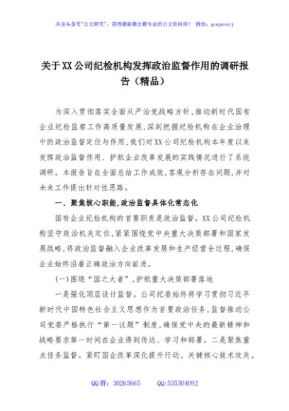 / 关于XX公司纪检机构发挥政治监督作用的调研报告(精品)