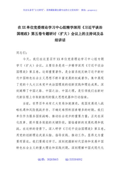 / 在XX单位党委理论学习中心组精学深用《习近平谈治国理政》第五卷专题研讨(扩大)会议上的主持词及总结讲话