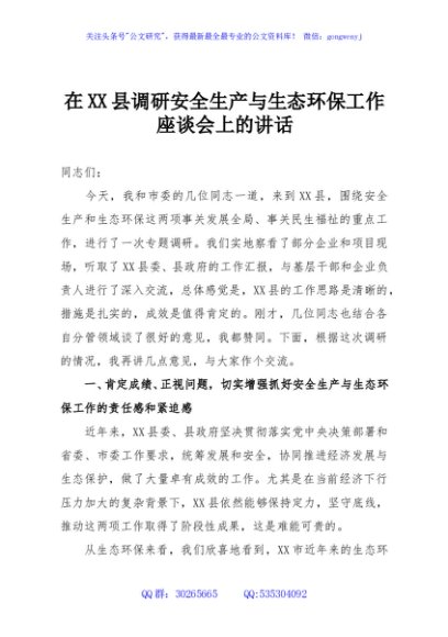 / 在XX县调研安全生产与生态环保工作座谈会上的讲话