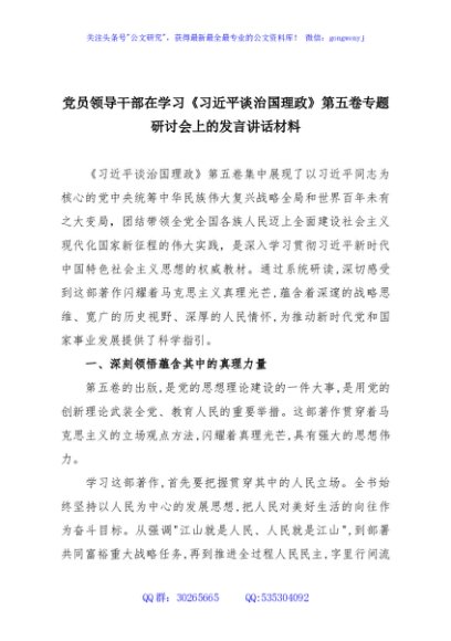 / 党员领导干部在学习《习近平谈治国理政》第五卷专题研讨会上的发言讲话材料