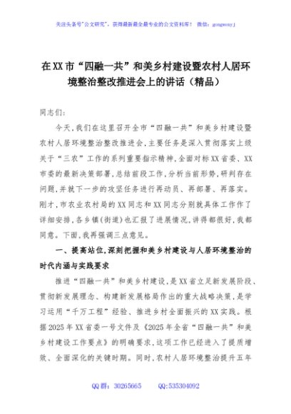 / 在XX市“四融一共”和美乡村建设暨农村人居环境整治整改推进会上的讲话(精品)