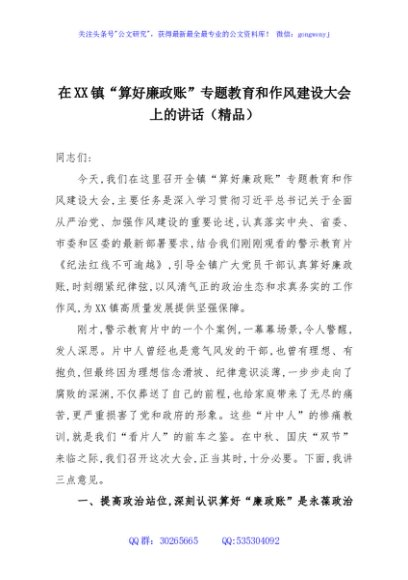 / 在XX镇“算好廉政账”专题教育和作风建设大会上的讲话(精品)