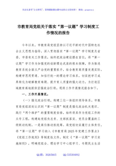 / 市教育局党组关于落实“第一议题”学习制度工作情况的报告