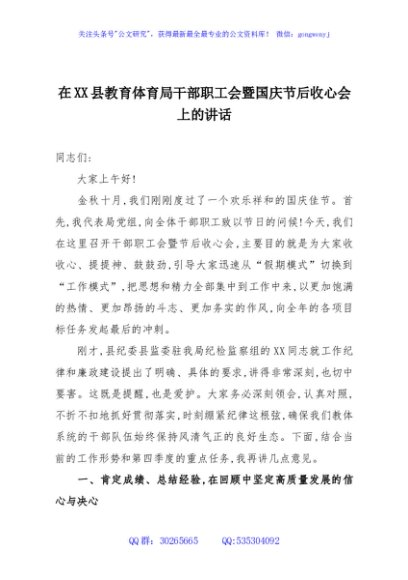/ 在XX县教育体育局干部职工会暨国庆节后收心会上的讲话