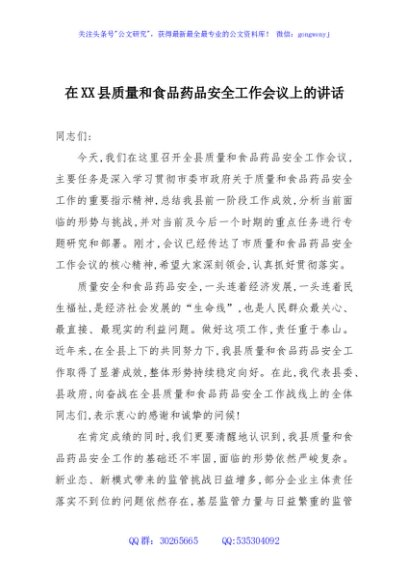 / 在XX县质量和食品药品安全工作会议上的讲话