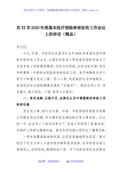 / 在XX市2026年度基本医疗保险参保征收工作会议上的讲话(精品)