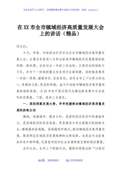 / 在XX市全市镇域经济高质量发展大会上的讲话(精品)